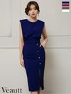 気品溢れる大人レディに♡ [Veautt/ヴュート] 高級 ブランド タイト膝丈ドレス ノースリーブ パールボタン スリット 大人 シンプル 胸元カバー ワンカラー