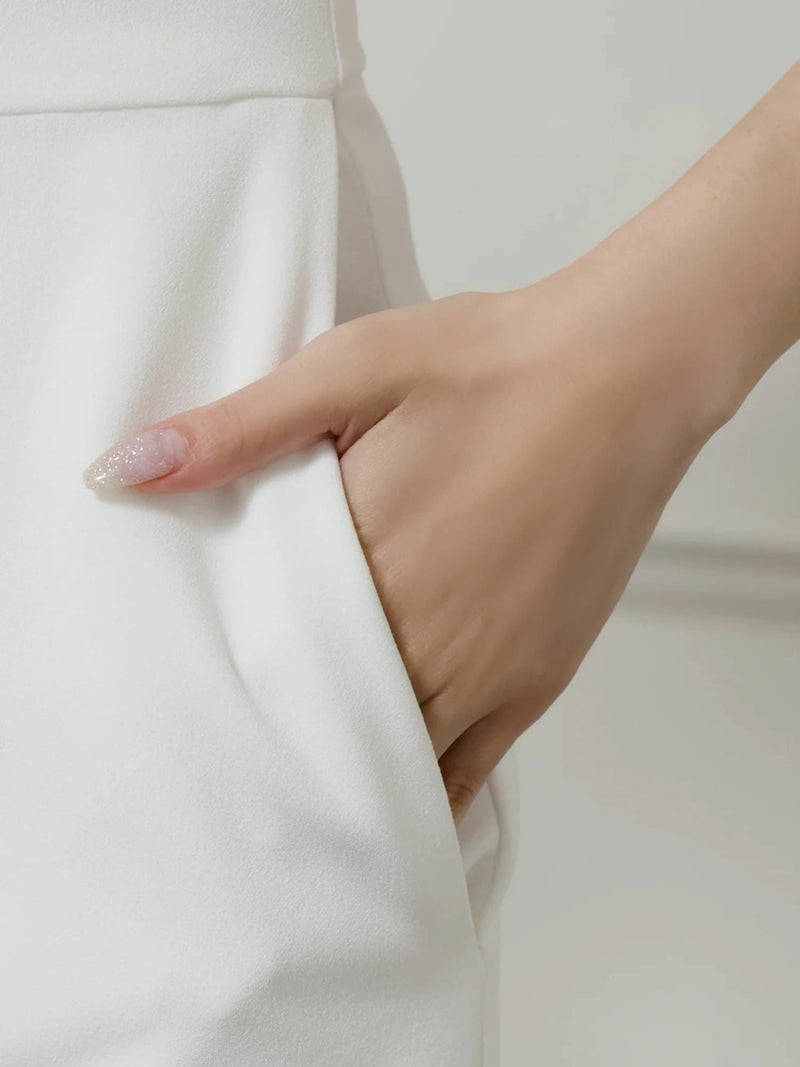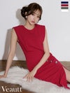 煌めくボタンが縦のラインを強調♡ [Veautt/ヴュート] 高級 ブランド タイト膝丈ドレス ノースリーブ パールボタン スリット 大人 シンプル 胸元カバー ワンカラー
