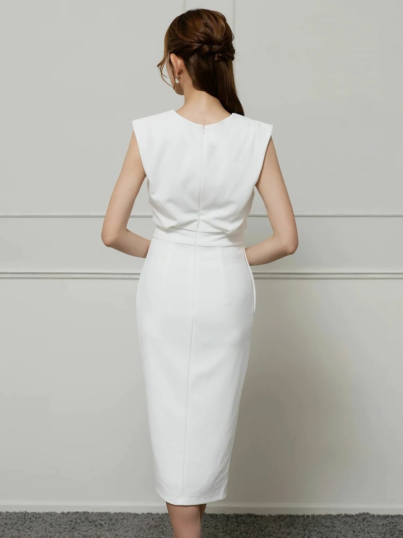 4. [Veautt/ヴュート] 高級 ブランド タイト膝丈ドレス ノースリーブ パールボタン 胸元カバー スリット 大人 シンプル ワンカラー (伊藤舞雪着用)