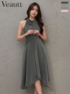 ドレープが美しさを引き立てる♡ [Veautt/ヴュート] 高級 ブランド Aライン 膝丈ドレス ホルターネック 胸元カバー ドレープ アシンメトリー ワンカラー