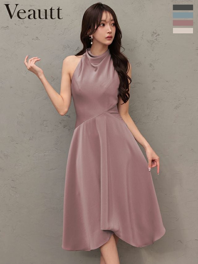 動いても美しいシルエットに♡ [Veautt/ヴュート] 高級 ブランド Aライン 膝丈ドレス ホルターネック 胸元カバー ドレープ アシンメトリー ワンカラー