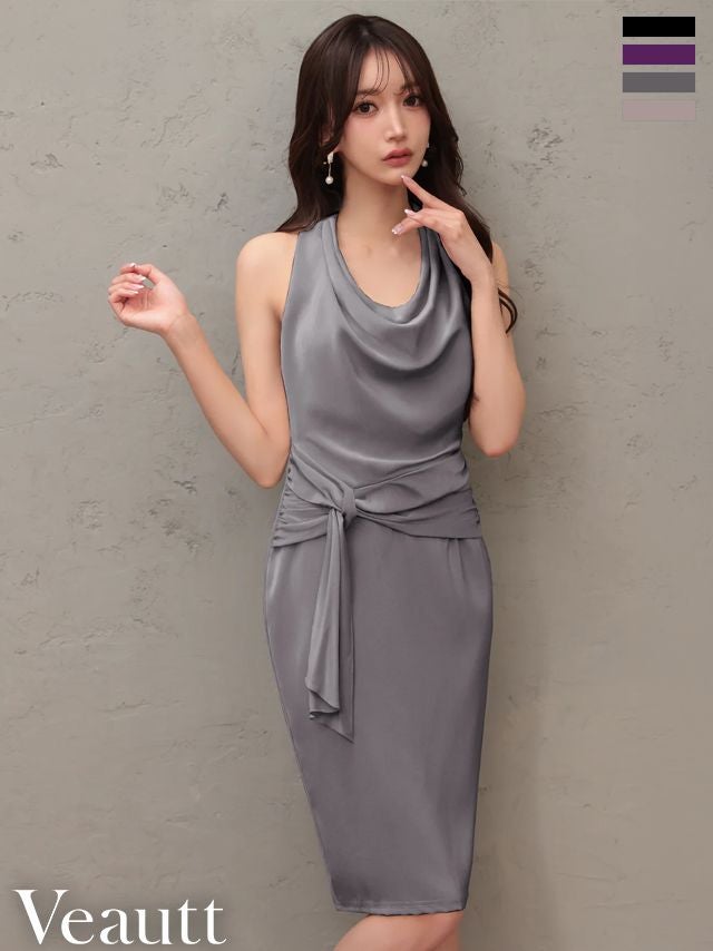 4. 予約商品【3月下旬入荷予定】[Veautt/ヴュート] 高級 ブランド タイト膝丈ドレス ホルターネック ドレープ 背中魅せ ワンカラー 大人