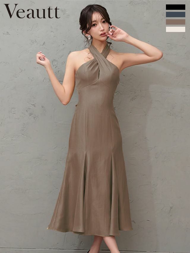 クロスネックで洗練された印象に♡ [Veautt/ヴュート] 高級 ブランド Aライン マーメイド 膝丈ドレス クロスホルターネック 背中魅せ 胸元カバー バックリボン