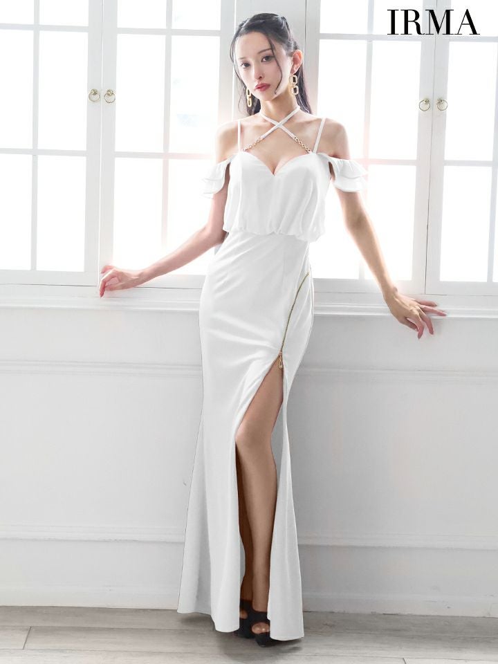 他の画像を見る sexyで印象的なお顔周りに♡ [IRMA/イルマ] 高級 肩出し 二の腕カバー フリル袖 クロスネック シフォン ファスナースリット タイトロングドレス ¥ 32,780 税込 お気に入りに追加