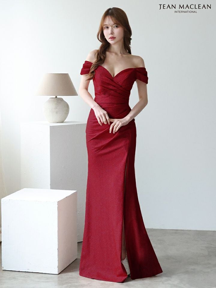 他の画像を見る デコルテラインを美しく魅せる♡ [JEANMACLEAN/ジャンマクレーン] 高級 バースデー オフショルダー ラメ タックデザイン バックスピンドル スリット タイトロングドレス ¥ 32,780 税込 お気に入りに追加