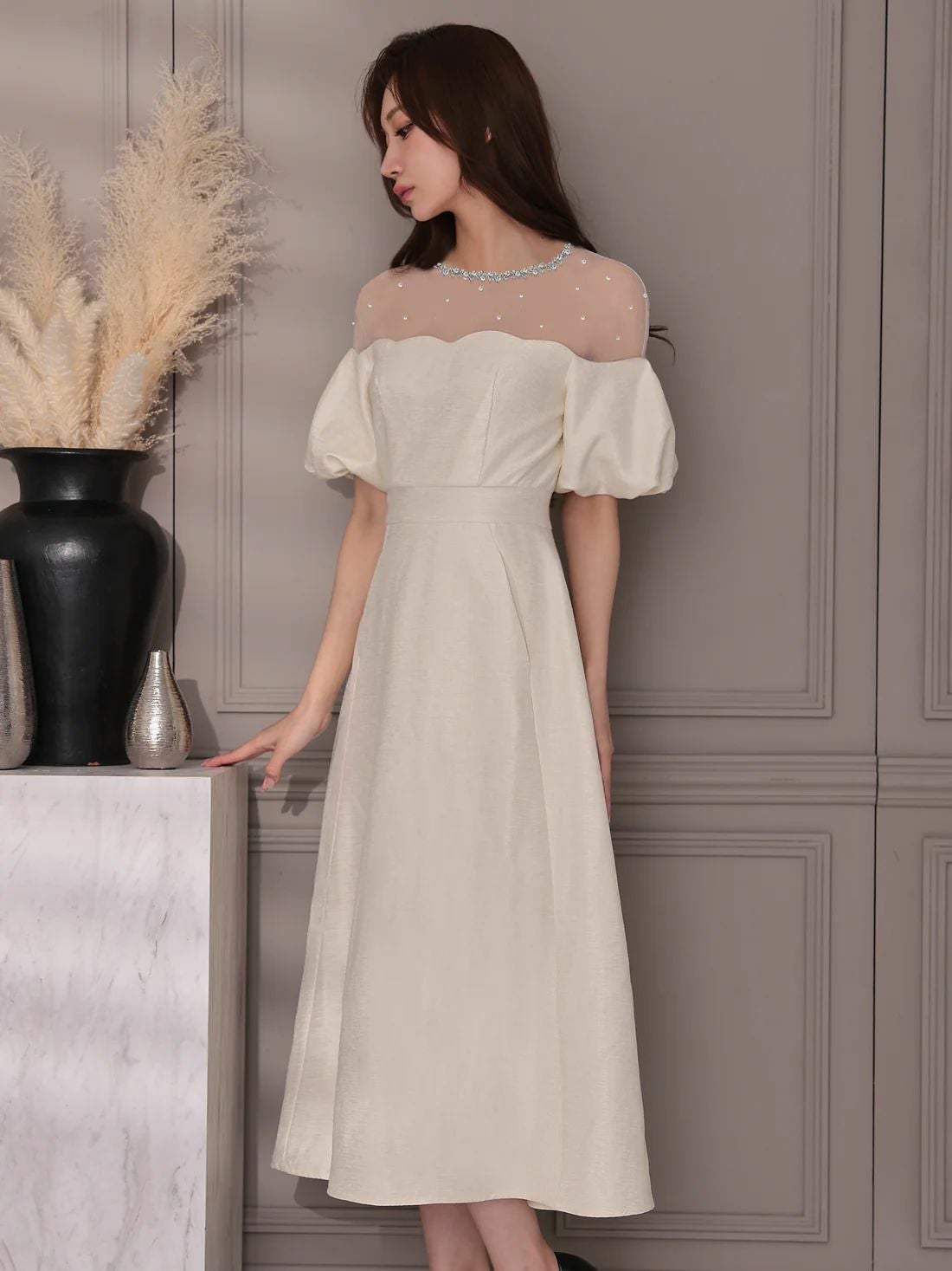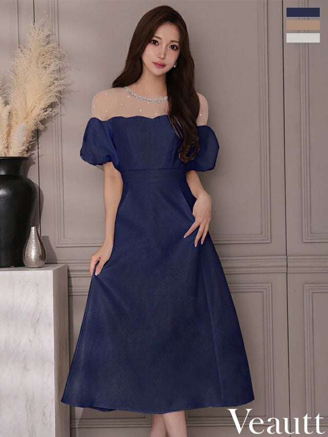 他の画像を見る 女性らしさ溢れるデザイン♡ [Veautt/ヴュート] 高級 半袖 パフスリーブ シアー ビジュー ワンカラー ポケット付き Aラインロングドレス ¥ 29,480 税込 お気に入りに追加