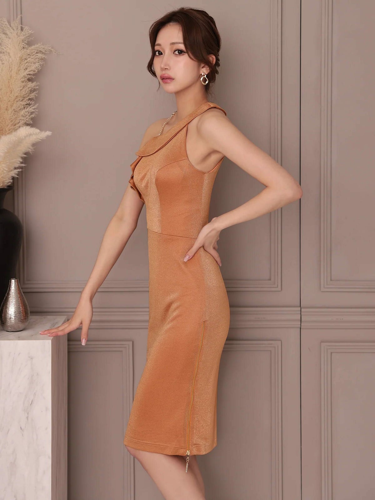 他の画像を見る エレガントな雰囲気を纏う♡ [Veautt/ヴュート] 高級 ブランド タイト膝丈ドレス アシンメトリー ノースリーブ チェーン 胸元フリル ファスナースリット (ゆんころ着用) ¥ 28,380 税込 お気に入りに追加