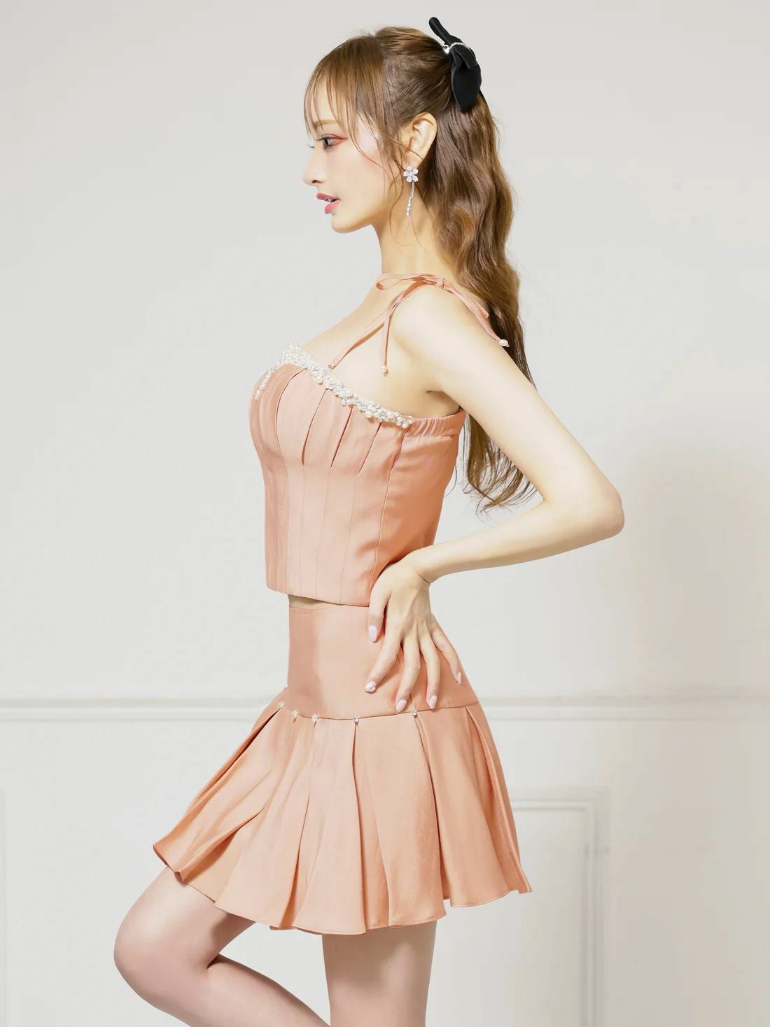 他の画像を見る 視線を惹きつけるミニドレス☆ [Angel-R/エンジェルアール] 高級 2way ベアトップ リボンキャミソール セットアップ ビジューパール プリーツ フレアミニドレス ¥ 29,480 税込 お気に入りに追加