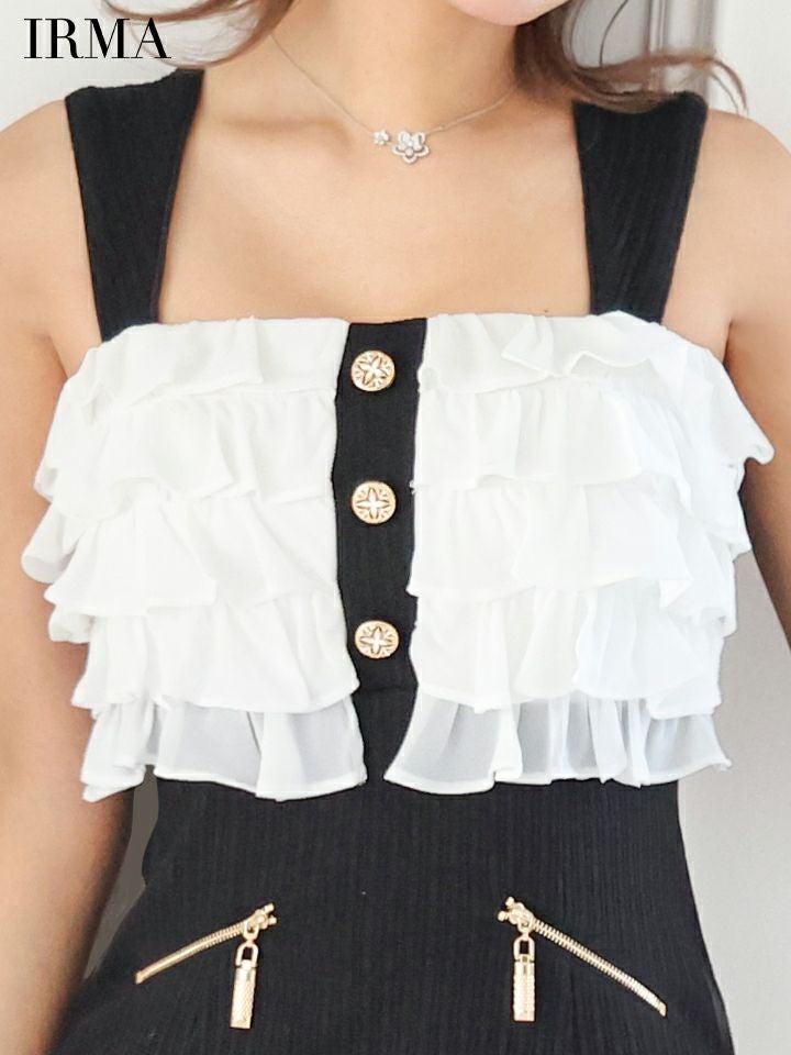 他の画像を見る 大人可愛いデザインがポイント☆ [IRMA/イルマ] 高級 ノースリーブ ジップ シフォンフリル 柄織りニット ゴールドボタン タイトミニドレス ¥ 31,680 税込 お気に入りに追加