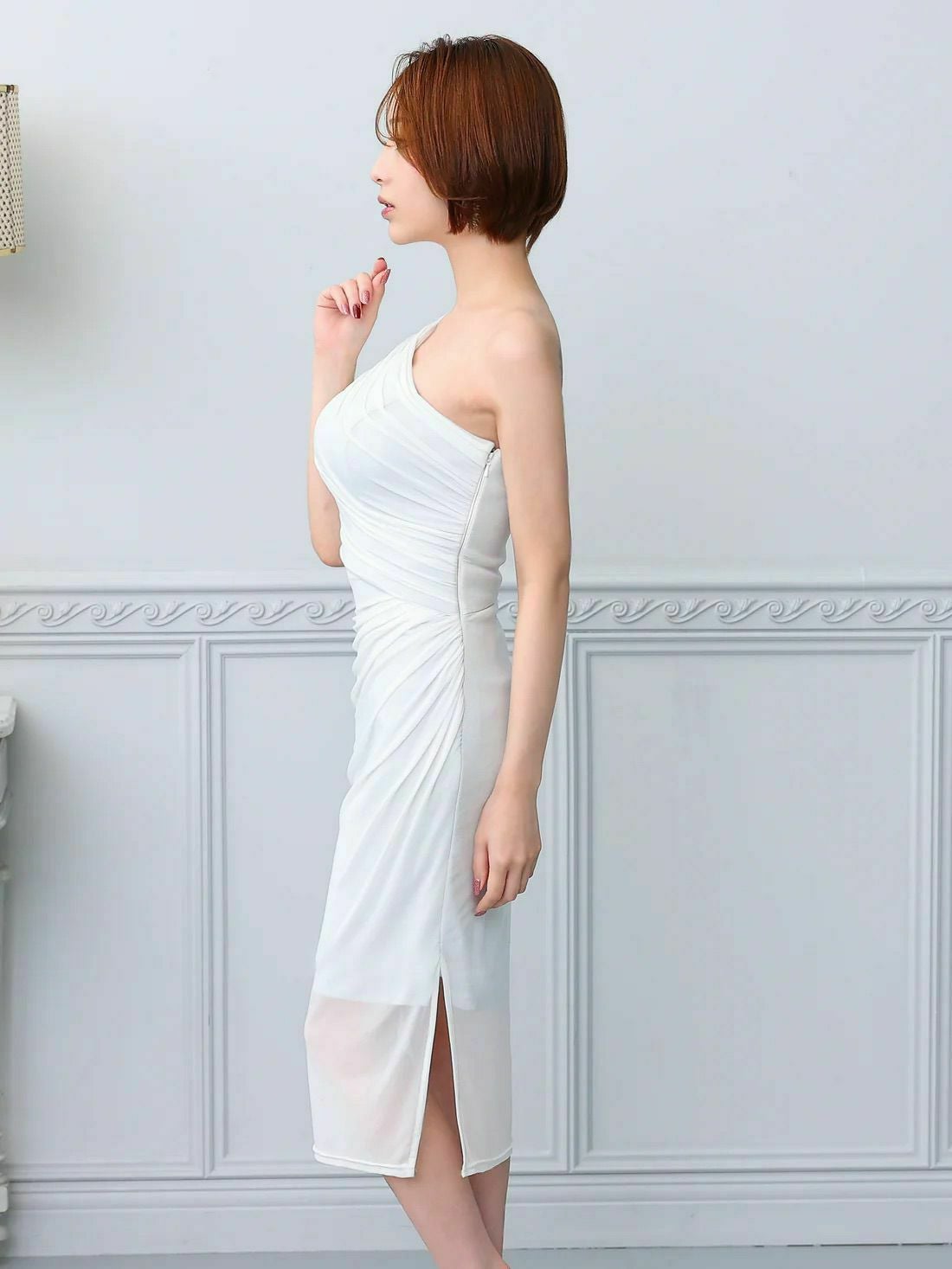 他の画像を見る 魅惑的な谷間をアピール♡ [Veautt/ヴュート] 高級 バストカット チェーン ワンショルダー ギャザー ラップ風 アシメスリット タイト 膝丈ドレス (ゆんころ着用) ¥ 28,380 税込 お気に入りに追加