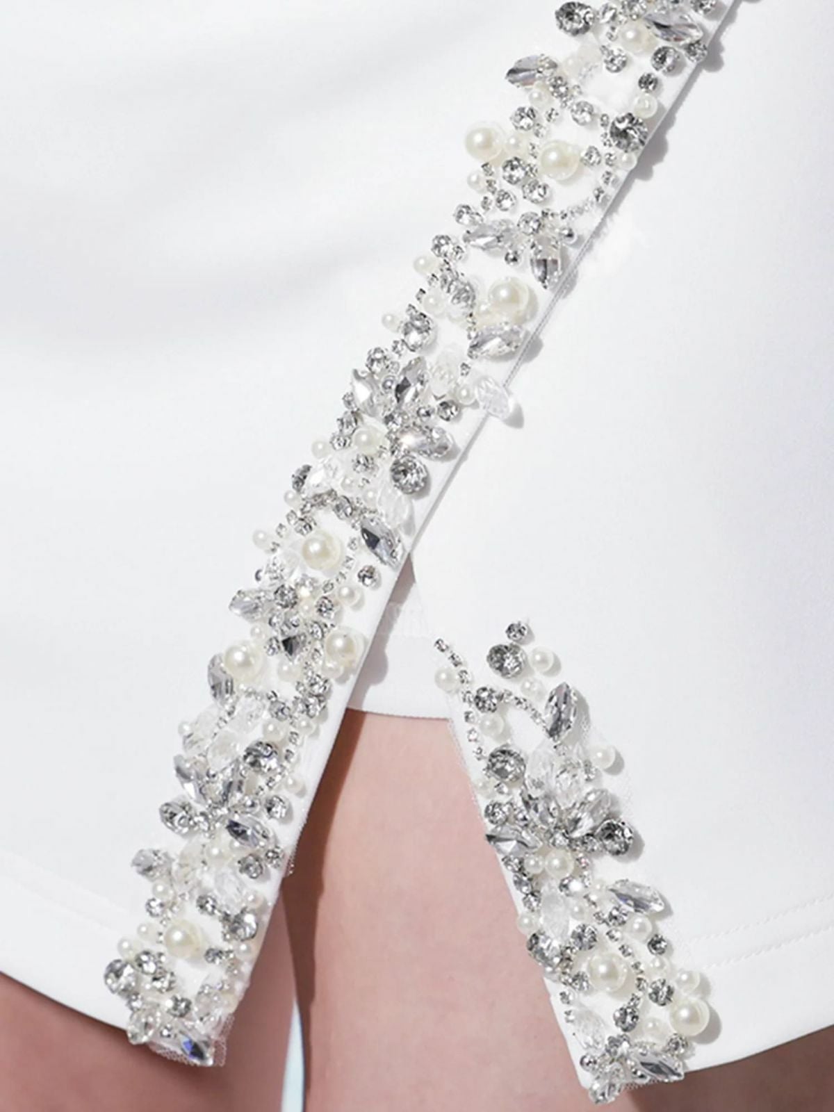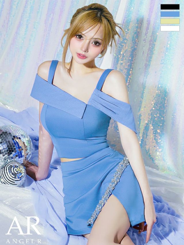 他の画像を見る 煌めくビジューで華やかに美脚魅せ♡ [Angel-R/エンジェルアール] 高級 アシンメトリー 肩出し 二の腕カバー ビジュー ラップ風 アシメスリット セットアップ タイトミニドレス ¥ 29,480 税込 お気に入りに追加
