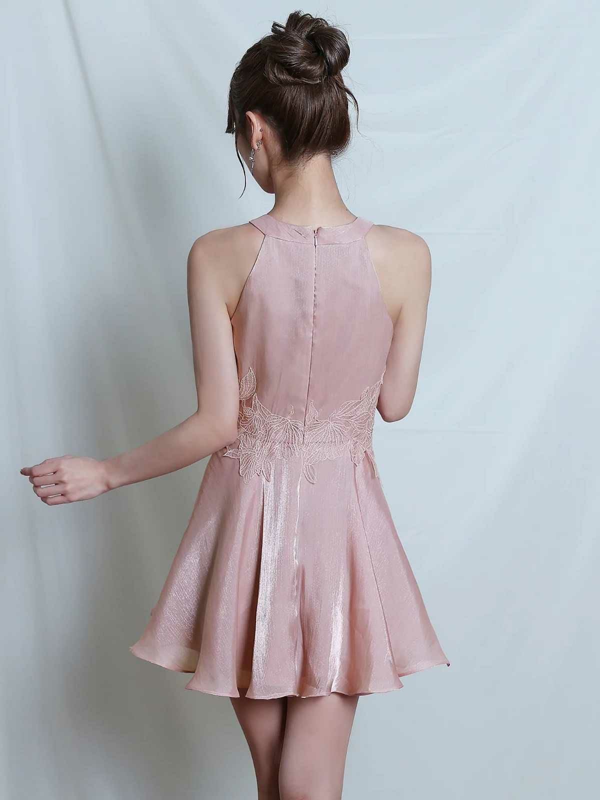 他の画像を見る フレアシルエットで細見え効果抜群♡ [Angel-R/エンジェルアール] 高級 ブランド フレアミニドレス ネックリボン ホルターネック 胸元カバー フラワー刺繍 シフォン ¥ 31,680 税込 お気に入りに追加