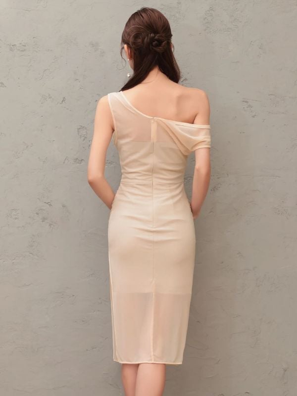 他の画像を見る ドレープで細見え効果を叶える♡ 予約商品【3月下旬入荷予定】[Veautt/ヴュート] 高級 ブランド タイト膝丈ドレス ワンショルダー シアー スリット ワンカラー ¥ 28,380 税込 お気に入りに追加