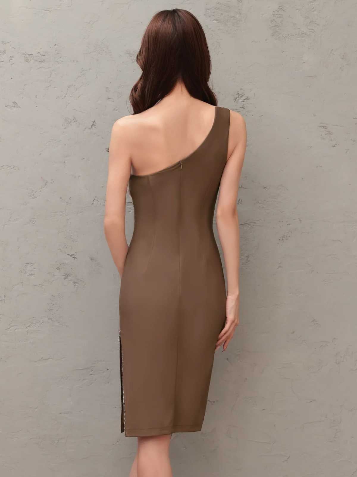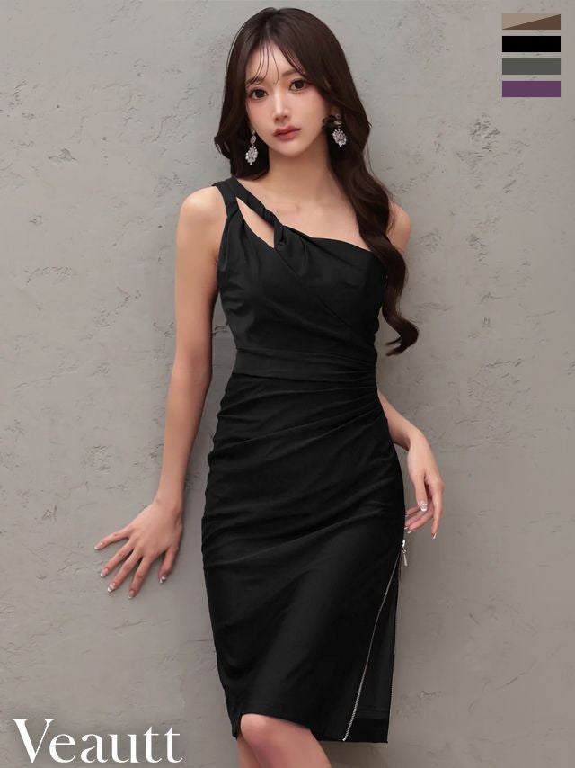 他の画像を見る ジップスリットで美脚アピール♡ 予約商品【3月下旬入荷予定】[Veautt/ヴュート] 高級 ブランド タイト膝丈ドレス ワンショルダー ウエストタック ファスナースリット ¥ 29,480 税込 お気に入りに追加
