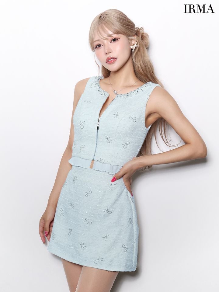 他の画像を見る 煌めくビジューで華やかに♡ 予約商品【4月下旬入荷予定】[IRMA/イルマ] 高級 ブランド タイトミニドレス 谷間 セットアップ ノースリーブ ジップ サマーツイード リボンモチーフ フリル ¥ 32,780 税込 お気に入りに追加