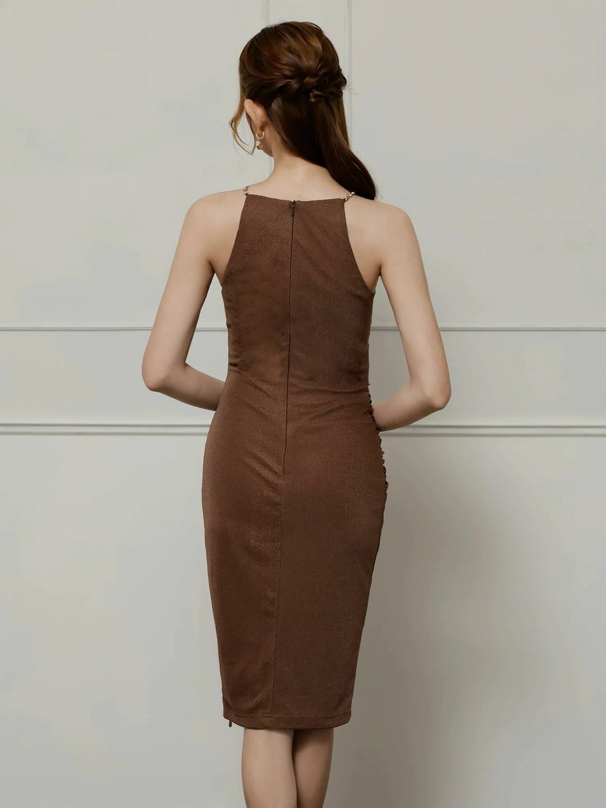 他の画像を見る 色気溢れるデコルテラインを演出♡ [Veautt/ヴュート] 高級 ブランド タイト膝丈ドレス ホルターネック スリット デコルテシアー ビジューチェーン ¥ 27,280 税込 お気に入りに追加