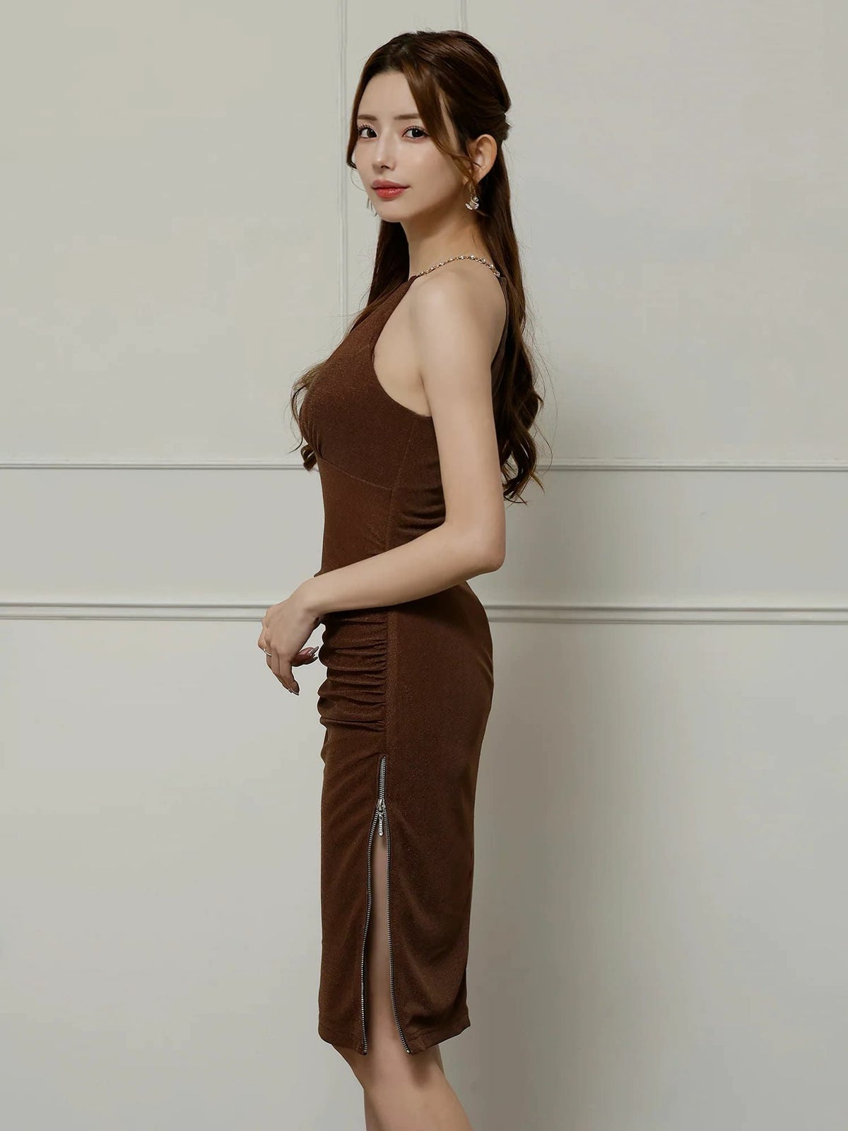 他の画像を見る ジップスリットで美脚アピール♡ [Veautt/ヴュート] 高級 ブランド タイト膝丈ドレス アシンメトリー キャミソール バストサテン ファスナースリット (ゆいぴす着用) ¥ 28,380 税込 お気に入りに追加