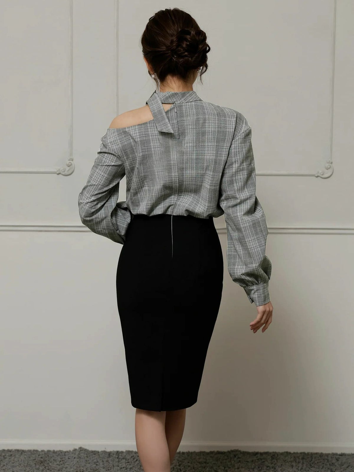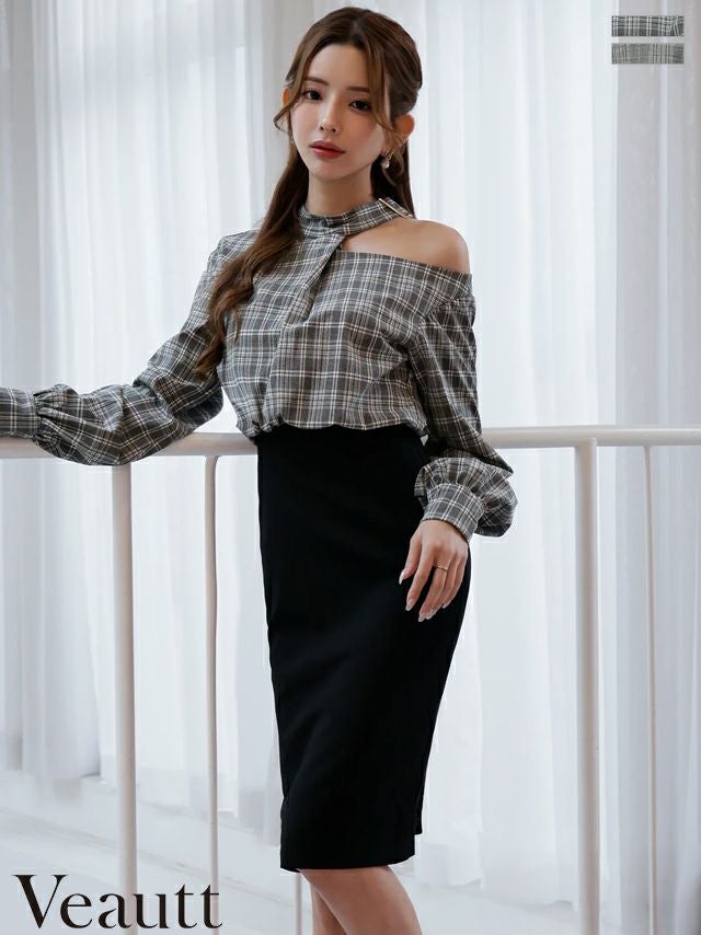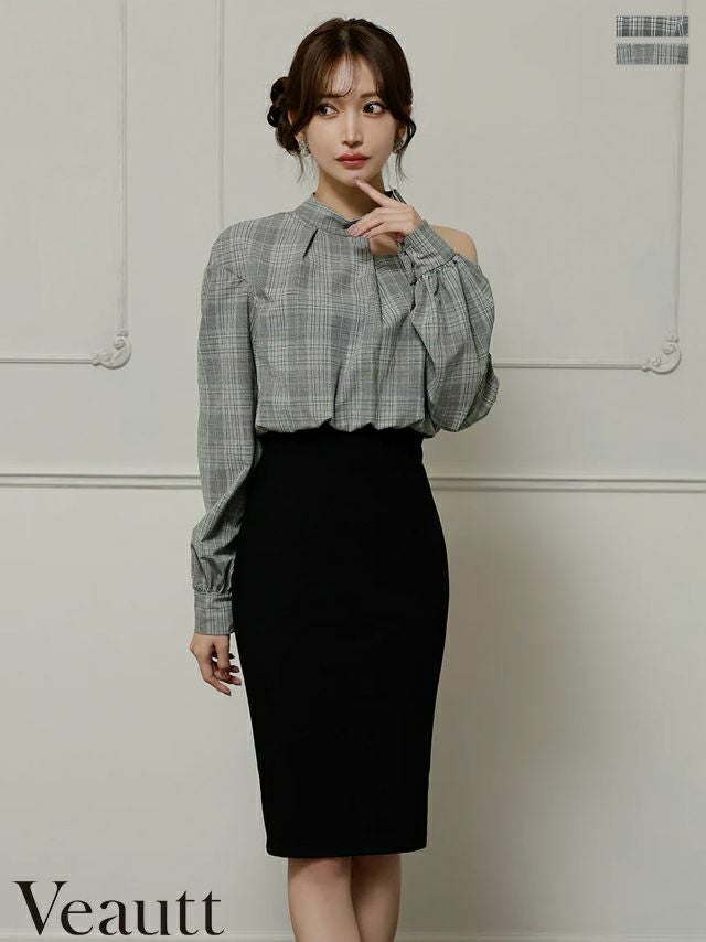 他の画像を見る 程よい肌見せで抜け感と色気を演出♡ [Veautt/ヴュート] 高級 ブランド タイト膝丈ドレス 長袖 チェック柄 アシンメトリーカット チョーカー風 胸元カバー ¥ 32,780 税込 お気に入りに追加