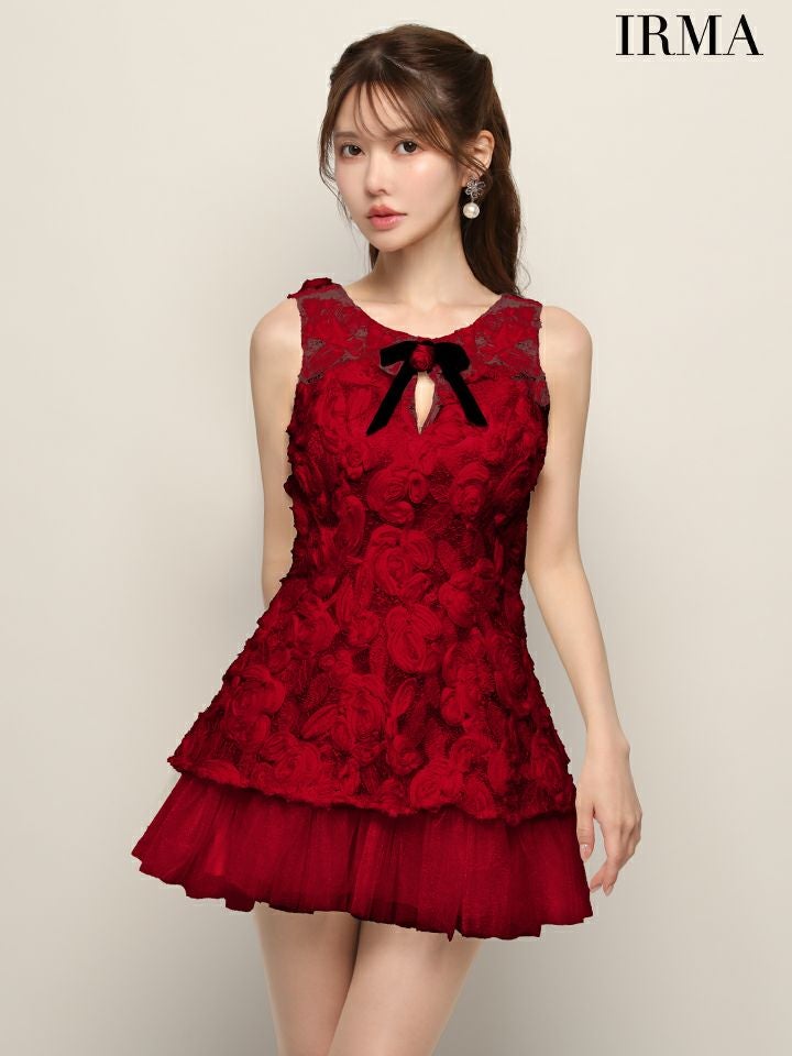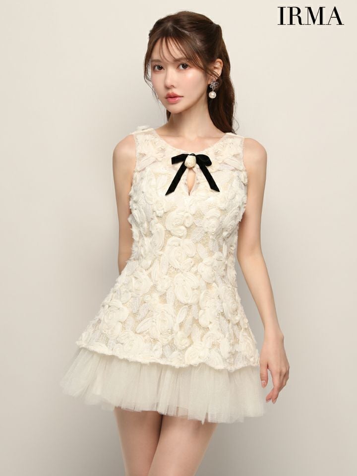 他の画像を見る 身に纏うだけでフェミニンな女性に♡ [IRMA/イルマ] 高級 ブランド Aラインミニドレス ノースリーブ 3Dフラワーレース チュール切替 リボンブローチ付き ¥ 29,480 税込 お気に入りに追加