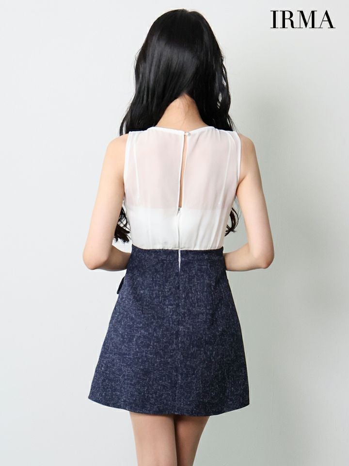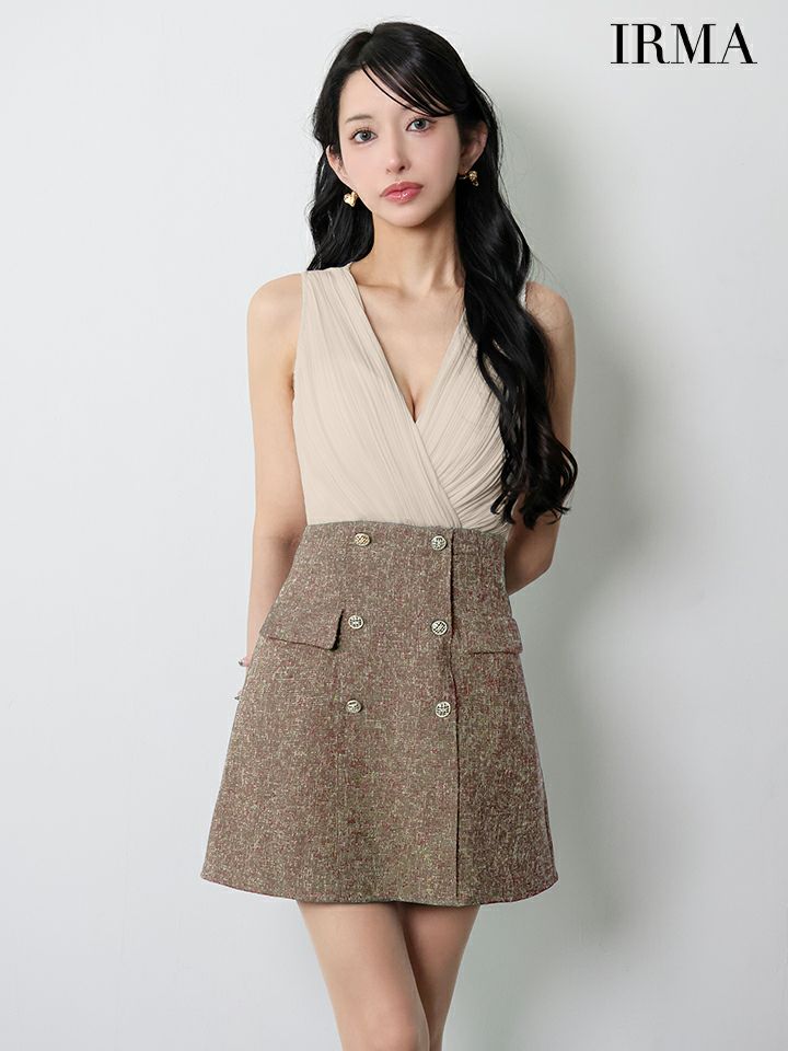 他の画像を見る 美しいバストラインをメイク♡ [IRMA/イルマ] 高級 ブランド Aラインミニドレス 谷間 ノースリーブ シフォン カシュクール ツイード切替 ダブルボタン ¥ 30,580 税込 お気に入りに追加