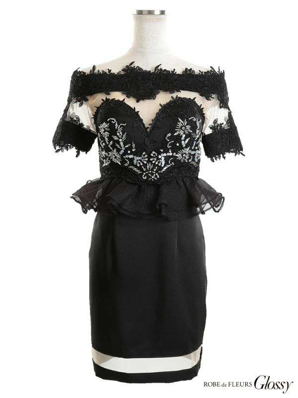5. [ROBEdeFLEURSGlossy/ローブドフルールグロッシー] 高級 オフショルダー ペプラム バストシースルー 谷間魅せ タイトミニドレス