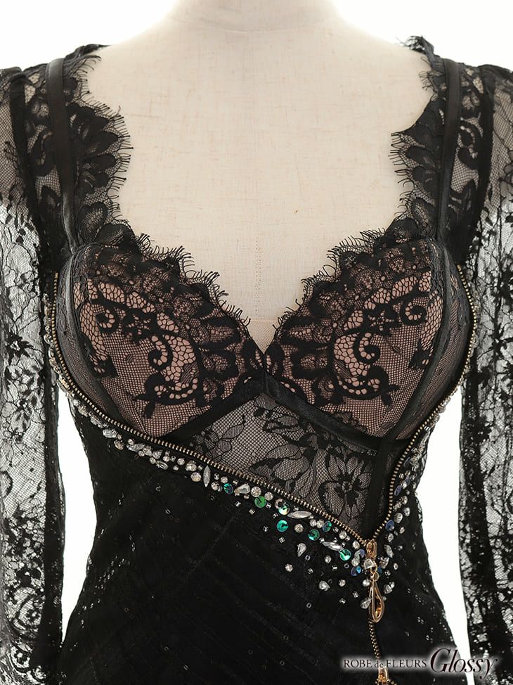 ビジューとレースが華やかラグジュアリードレス☆ SALE [ROBEdeFLEURSGlossy/ローブドフルールグロッシー] 高級レーススリーブジップデザインタイトミニドレス