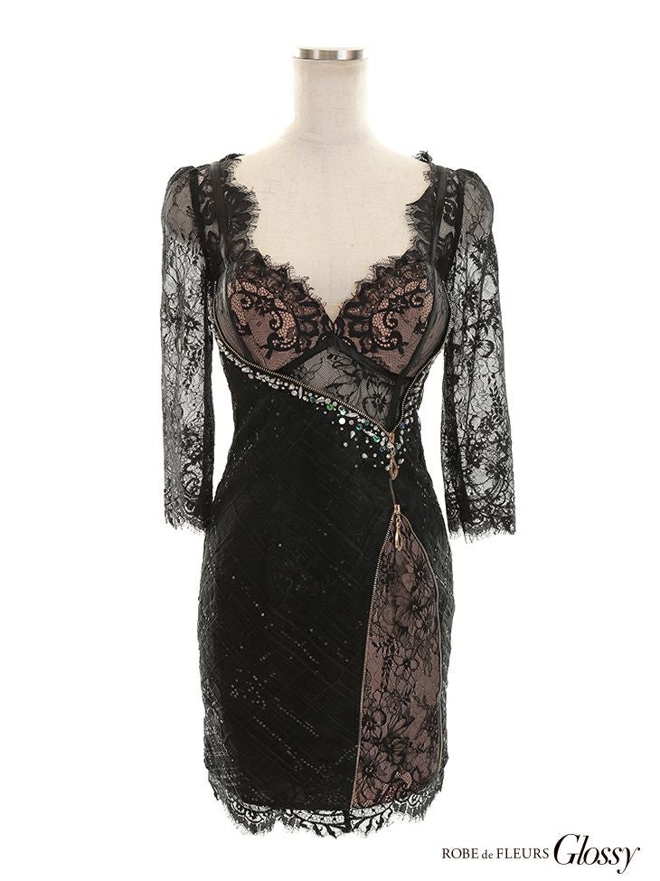 キャバドレス ミニドレス  [SALE] [ROBEdeFLEURSGlossy/ローブドフルールグロッシー] 高級レーススリーブジップデザインタイトミニドレス