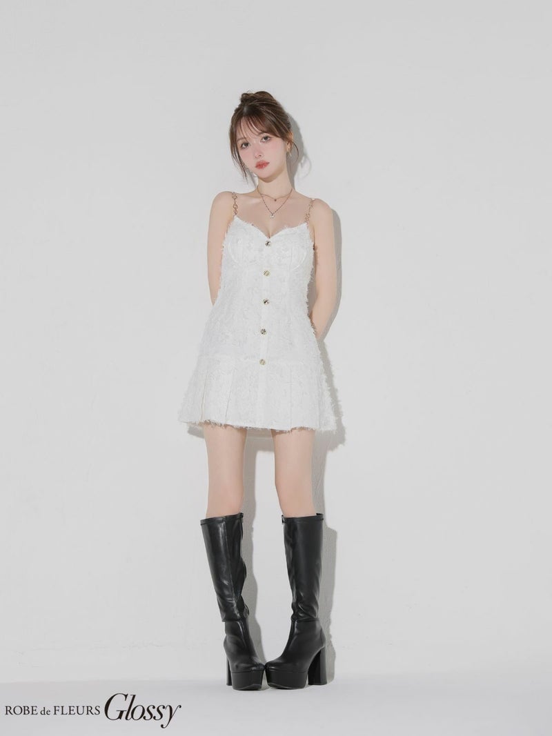 4. [ROBEdeFLEURSGlossy/ローブドフルールグロッシー] 高級 ブランド Aラインミニドレス 谷間 キャミソール チェーン ビジューボタン プリーツ フリンジレース