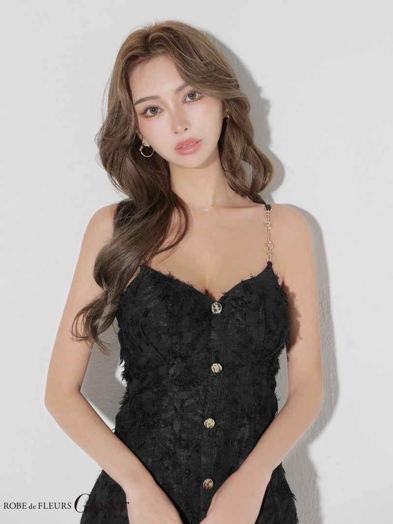5. [ROBEdeFLEURSGlossy/ローブドフルールグロッシー] 高級 ブランド Aラインミニドレス 谷間 キャミソール チェーン ビジューボタン プリーツ フリンジレース