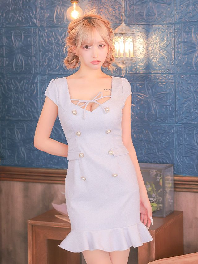 半袖 デコルテリボン ダブルパールボタン フェイクポケット ツイード 裾フリル タイトミニドレスの商品特徴