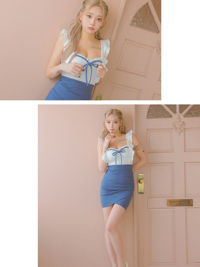 4. フリル袖キャミソールネックリボンサイドギャザーラップタイトミニドレス (Sサイズ~XLサイズ) (PyunA./キャバドレス着用)