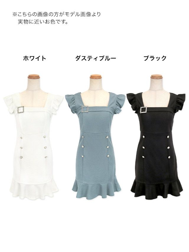 ノースリーブブリル袖ワンカラーパールダブルボタン裾フリルストレッチタイトミニドレスのカラーバリエーション