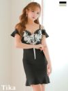 5. 肩出し 二の腕カバー バストカット レースアップ フラワー刺繍 ワッフル 裾フリル 谷間魅せ タイトミニドレス (Sサイズ~XLサイズ) (りせり/キャバドレス着用)
