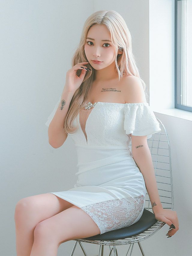 5. ビジューチャーム付き オフショルダー バストシースルー フラワーレース フリル袖 谷間魅せ レーススリット タイトミニドレス (Sサイズ~XLサイズ) (PyunA./キャバドレス着用)