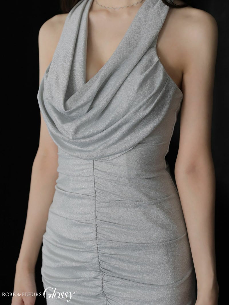 4. [ROBEdeFLEURSGlossy/ローブドフルールグロッシー] 高級 ブランド タイトミニドレス 背中魅せ ホルターネック カウルネック ラメニット ギャザー