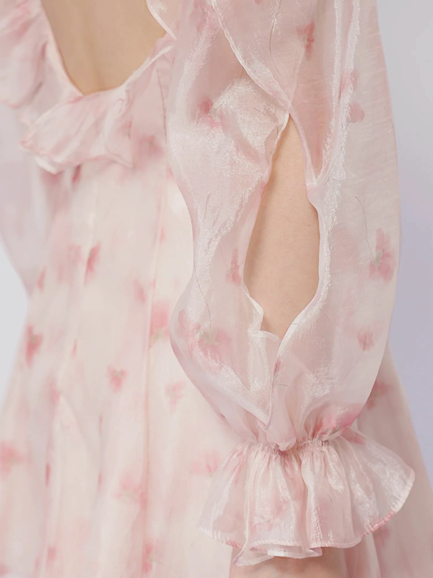 6. [Angel-R/エンジェルアール] 高級 ブランド Aラインミニドレス 長袖 肩出し ホルターネック 背中魅せ シフォン フラワープリント