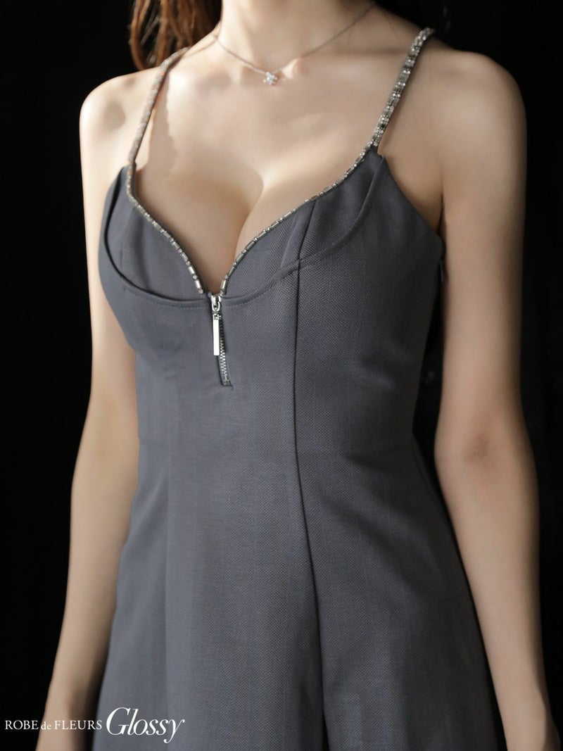 4. [ROBEdeFLEURSGlossy/ローブドフルールグロッシー] 高級 ブランド Aラインミニドレス 谷間 キャミソール 背中魅せ Vカット ジップ ビジュー プリーツ