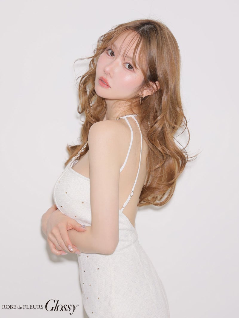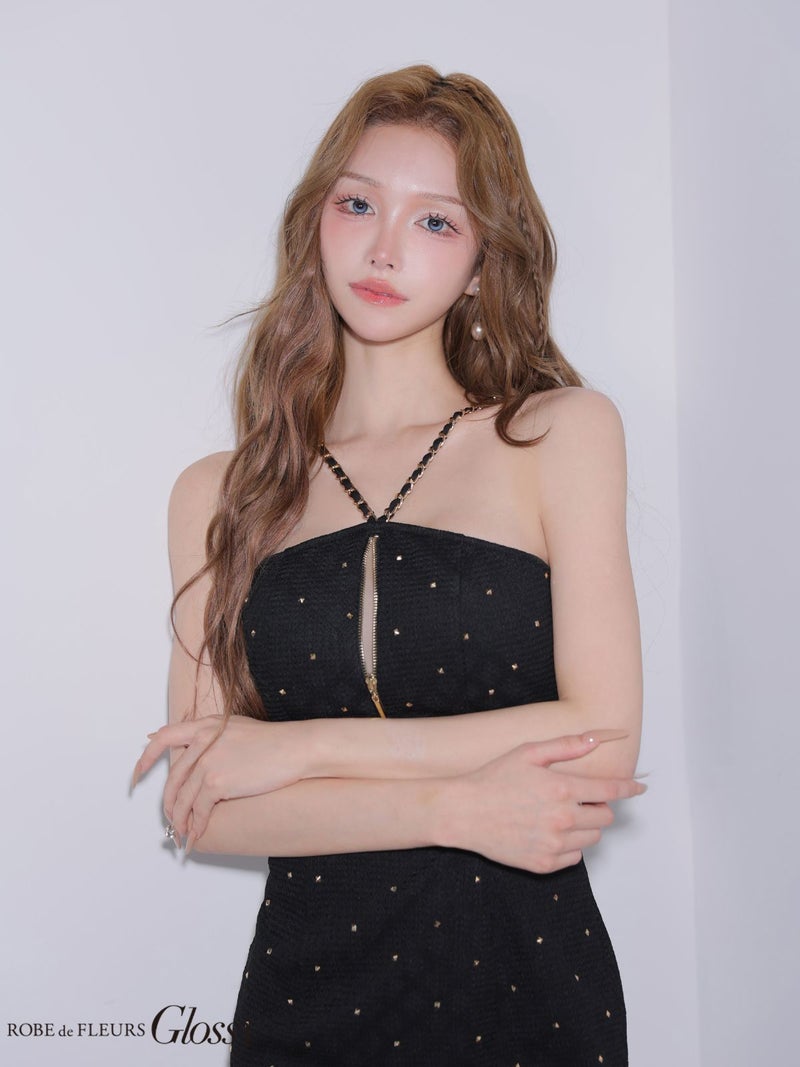 大胆な肌見せで視線を惹きつける♡ [ROBEdeFLEURSGlossy/ローブドフルールグロッシー] 高級 ブランド タイトミニドレス 谷間 ホルターネック 背中魅せ ジップ スタッズ ワンカラー