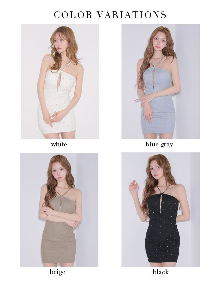 4. [ROBEdeFLEURSGlossy/ローブドフルールグロッシー] 高級 ブランド タイトミニドレス 谷間 ホルターネック 背中魅せ ジップ スタッズ ワンカラー