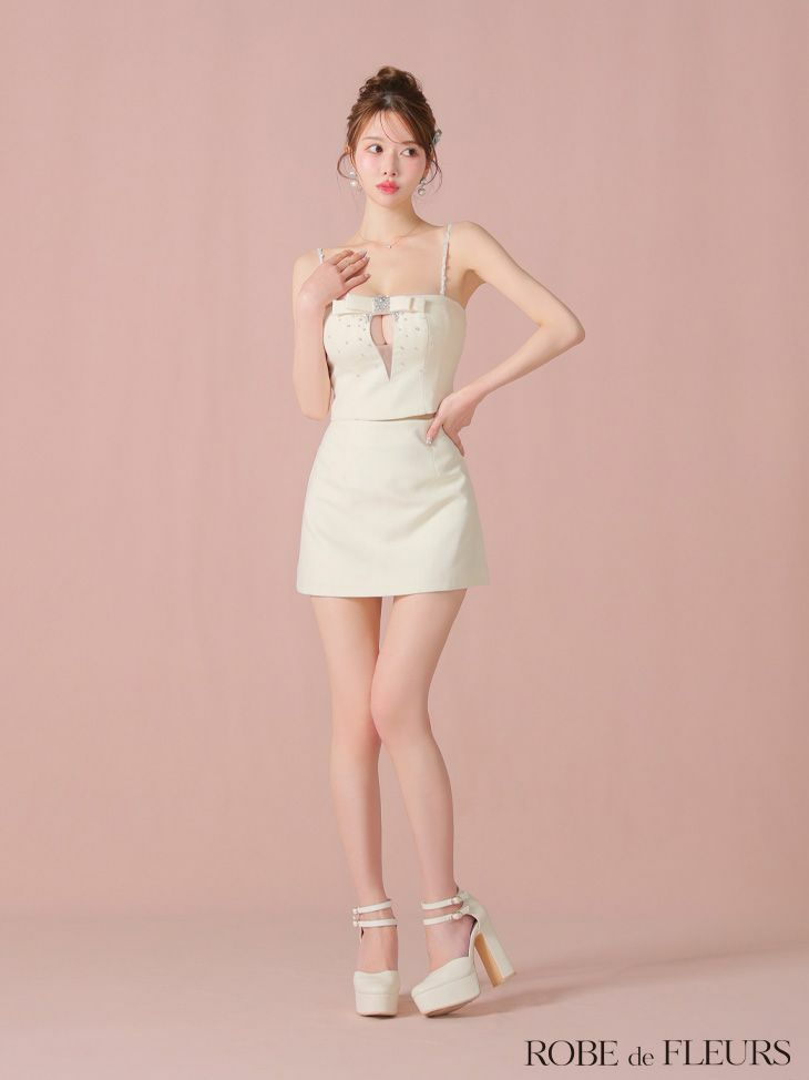 胸元リボンが可愛さをプラス♡ [ROBEdeFLEURS/ローブドフルール] 高級 2way キャミソール バストカット リボン ビジュー セットアップ 谷間魅せ タイトミニドレス