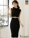 モノトーンで大人シックな1着☆ SALE [Veautt/ヴュート] 高級ウエストビジューバックVカットノースリーブ膝丈ワンピースタイトドレス