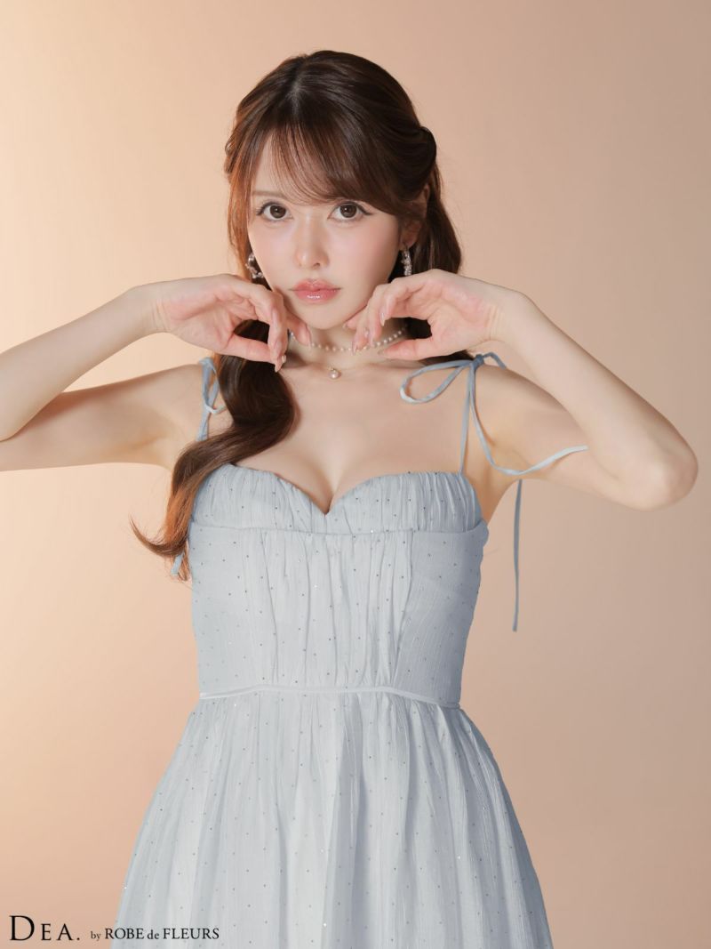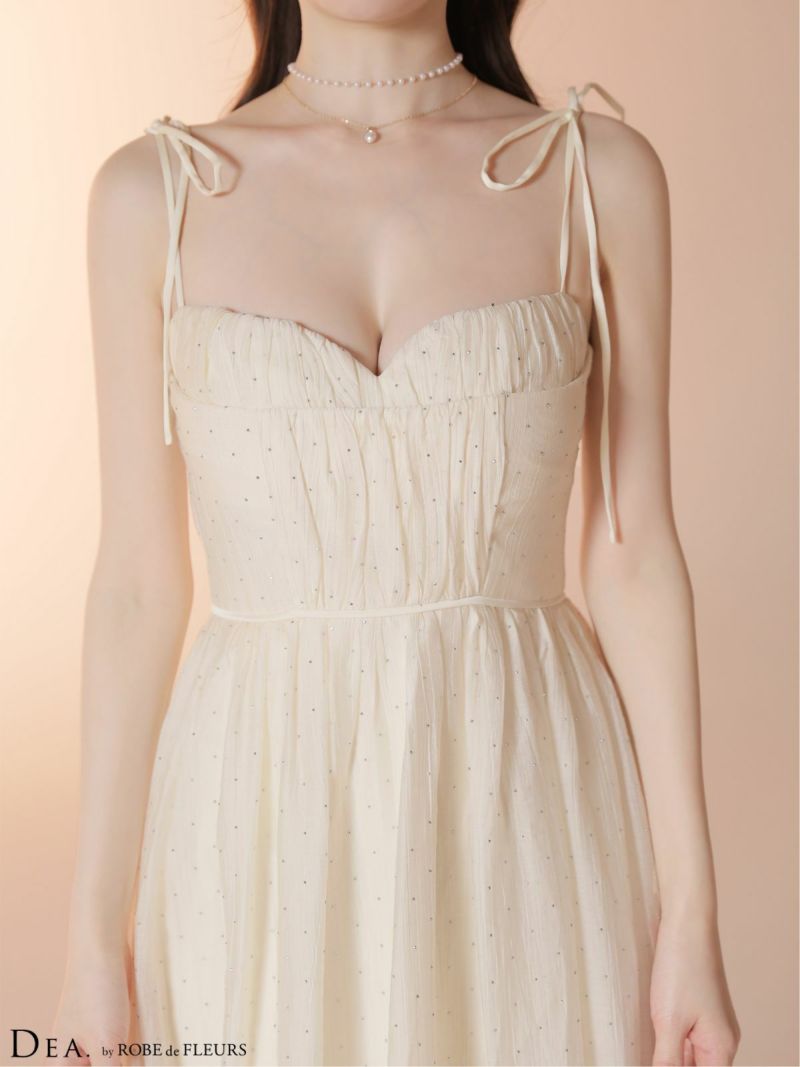 動くたびに輝きを放つ♡ [DEA.byROBEdeFLEURS/ディアバイローブドフルール] 高級 ブランド ワンピース Aラインロングドレスキャミソール ショルダーリボン ハートカット ビジュー シフォン