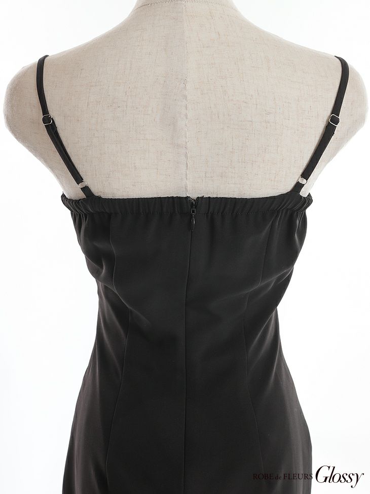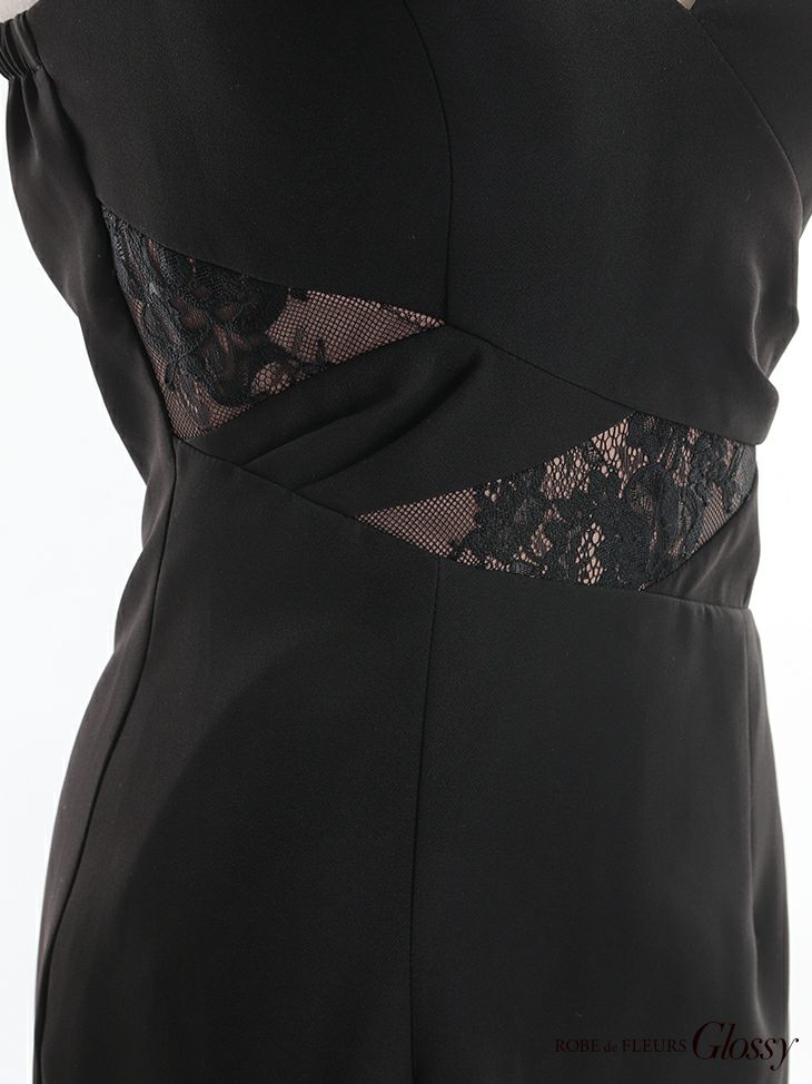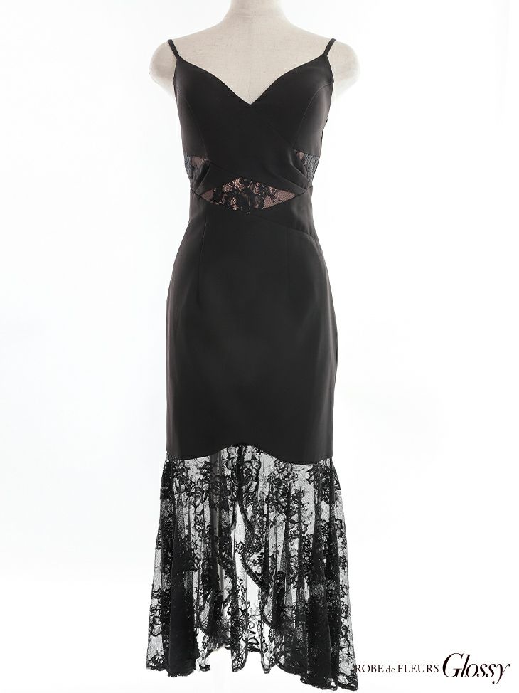 5. [ROBEdeFLEURSGlossy/ローブドフルールグロッシー] 高級ワンカラーウエストクロスレース切替アシメフリルマーメイドウエストカットキャミソールタイトロングドレス