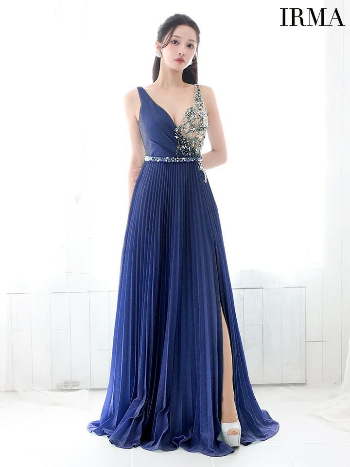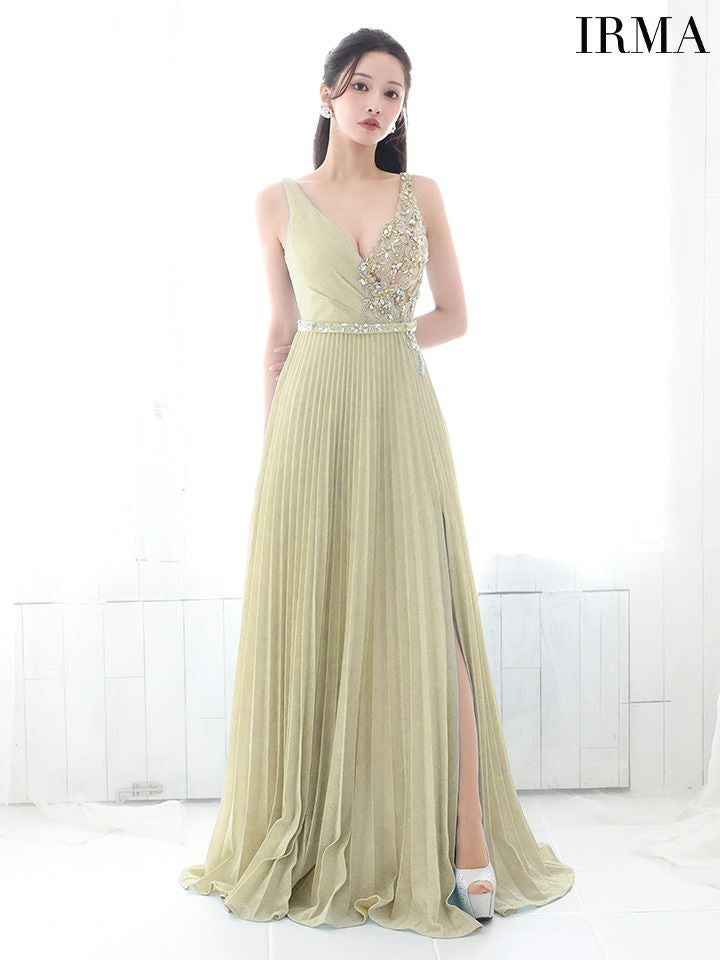 スリットで脚長効果抜群☆ [IRMA/イルマ] 高級 バースデーノースリーブラメニットビジューAラインロングドレス