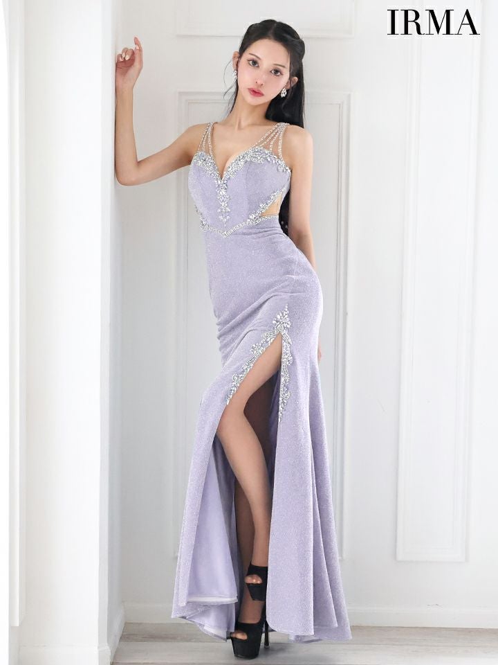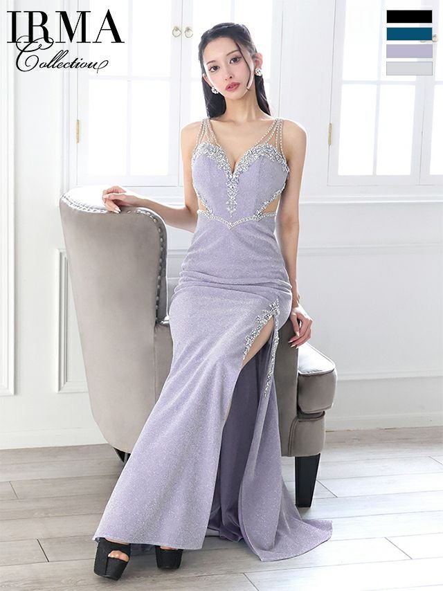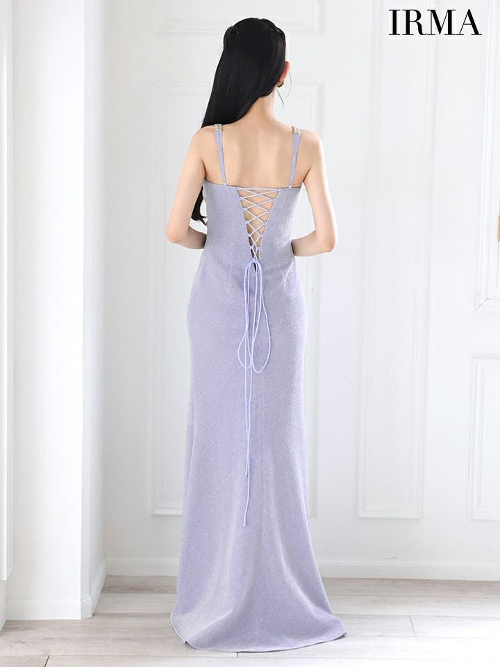 360度どこから見ても美しい♡ [IRMA/イルマ] 高級 ノースリーブ キラキラビジュー ラメニット 背中魅せ レースアップ スリット タイトロングドレス