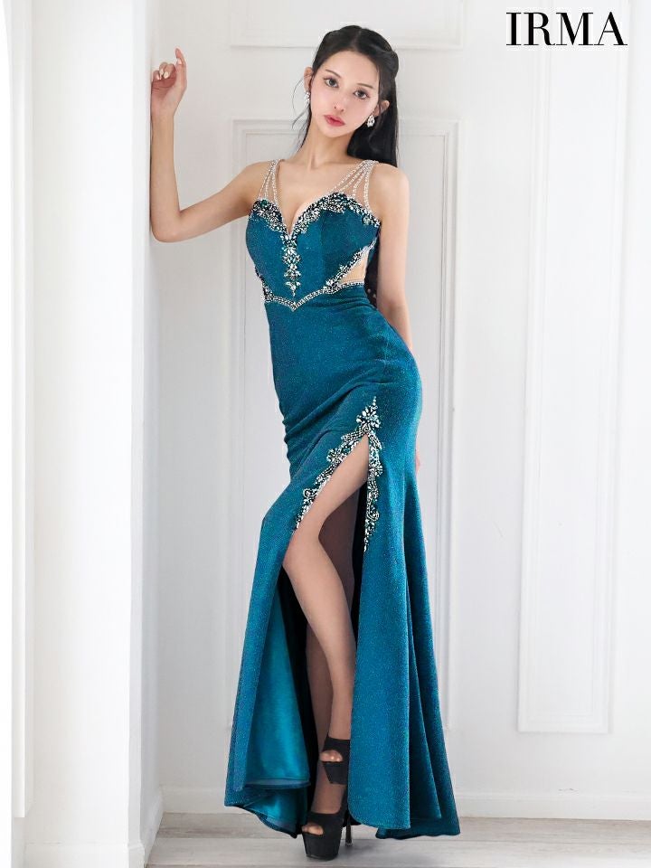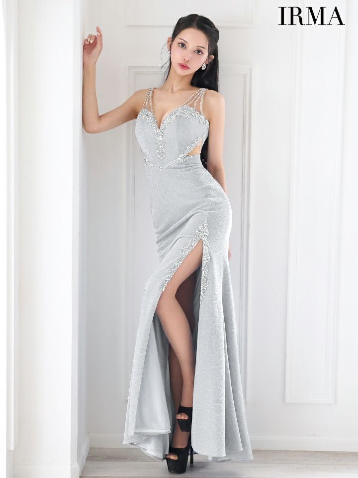 5. [IRMA/イルマ] 高級 ノースリーブ キラキラビジュー ラメニット 背中魅せ レースアップ スリット タイトロングドレス
