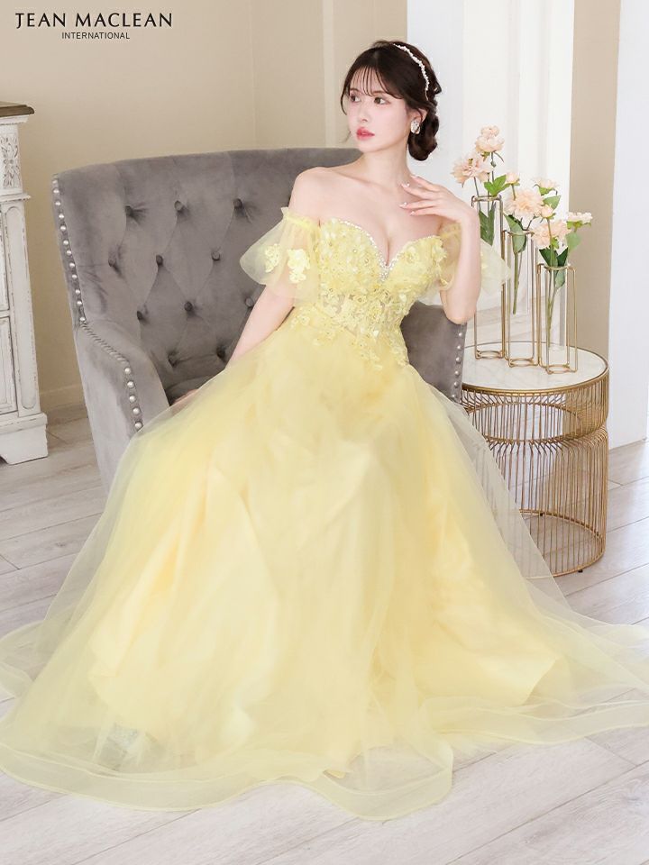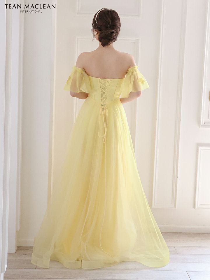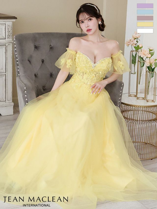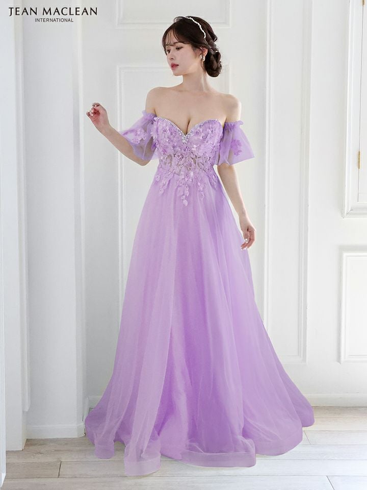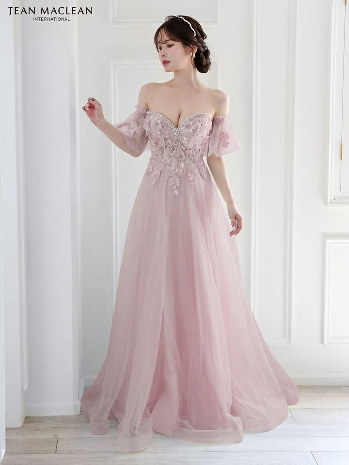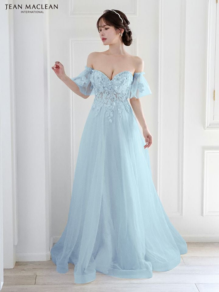 4. [JEANMACLEAN/ジャンマクレーン] 高級パフスリーブ付き立体フラワー刺繍ビジューベアチュールAラインロングドレス