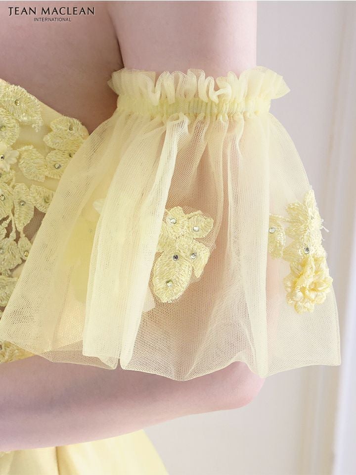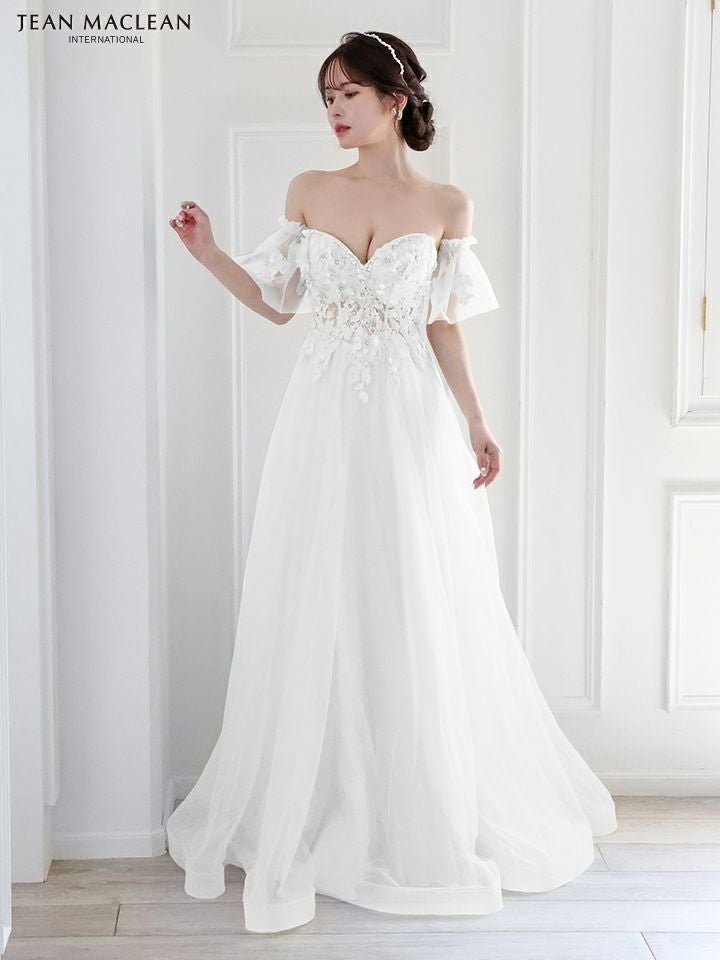 5. [JEANMACLEAN/ジャンマクレーン] 高級パフスリーブ付き立体フラワー刺繍ビジューベアチュールAラインロングドレス