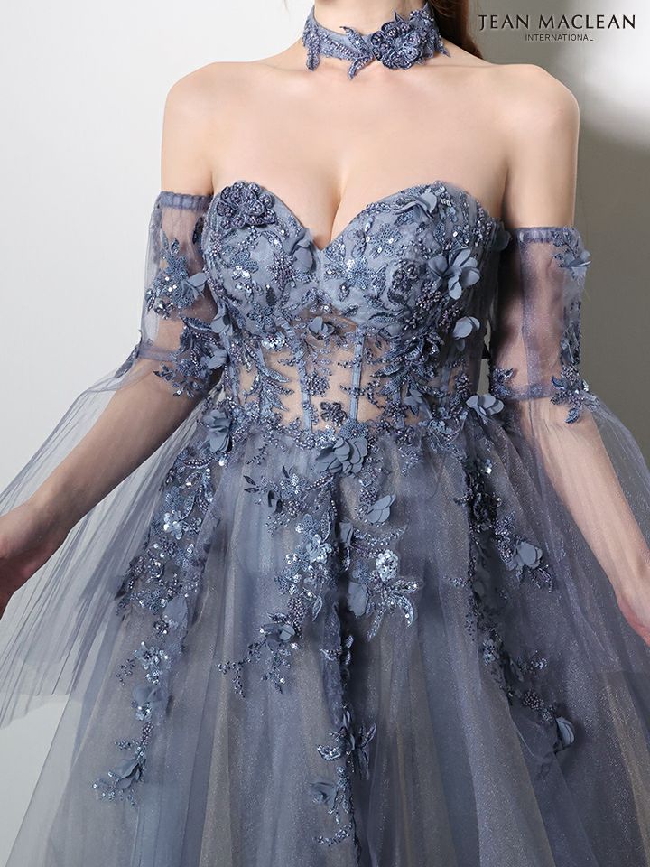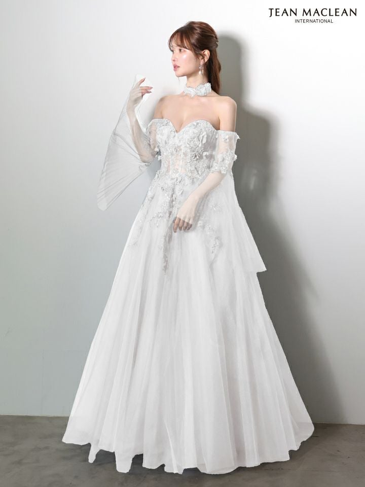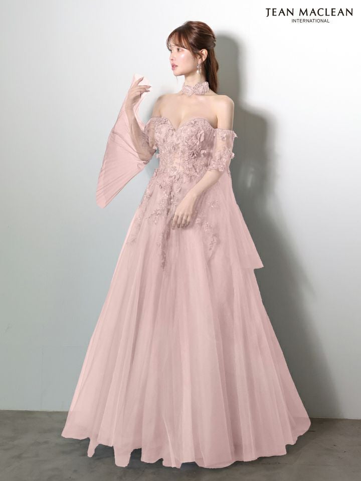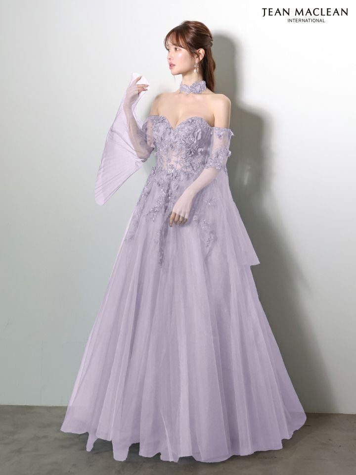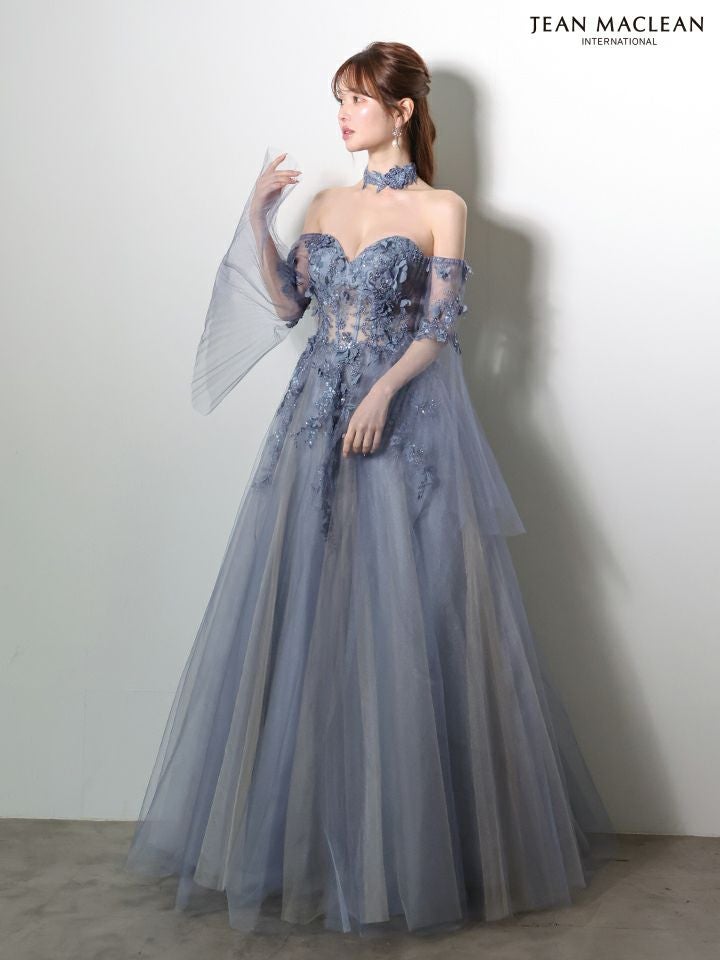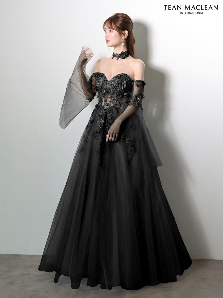 5. [JEANMACLEAN/ジャンマクレーン] 高級 ブランド バースデー Aラインロングドレス 谷間 フレアスリーブ付き ベア 2way シアーコルセット風 3Dフラワー