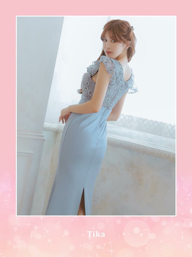 3. バックスリットあり フラワーレース バストジップ ウエストベルト バック フリル袖 タイトロングドレス (Sサイズ~XXLサイズ) (浦西ひかる/キャバドレス着用)